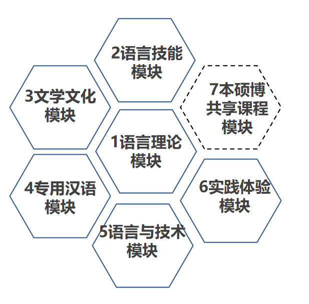 课程包括7大模块:语言理论模块、语言技能模块、语言教学模块、文学文化模块、语言与技术模块、实践体验模块、本硕博共享课程模块。