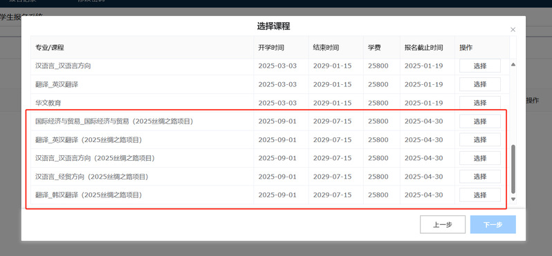 *请注意在报名系统中选择正确的丝绸之路项目专业申请路径,即 “选择课程-添加课程-选择类别-本科生-选择标注了“2025丝绸之路项目”的专业(如下图所示)”。