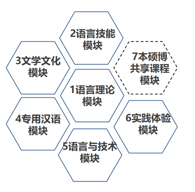 7. The Shared Course for Bachelor's and Master's Degrees Module includes the courses of Understanding Contemporary China, China's National Conditions, Study of Modern Chinese Grammar, Study of Modern Chinese Vocabulary, Study of Modern Chinese Function Word, Cross-cultural communication, Chinese-foreign Language Contrast and Nationalization Research, Chinese International Communication Research, Chinese Textbook Research, Chinese Mediated Language Corpus Research.