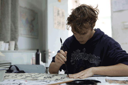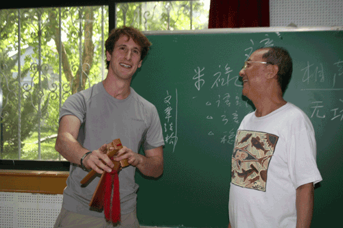 | 喀麦隆学生捷盖与丁广泉老师说相声 | 瑞士学生李牧接受丁广泉老师指导快板 |