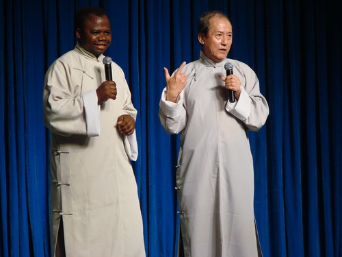 Цзе Гай(Камерун) говорит «Сяншэн» с преподавателем Дин Гуанцюань | преподаватель Дин Гуанцюань инструктирует Ли МУ(Швейцария) выступать куайбань |