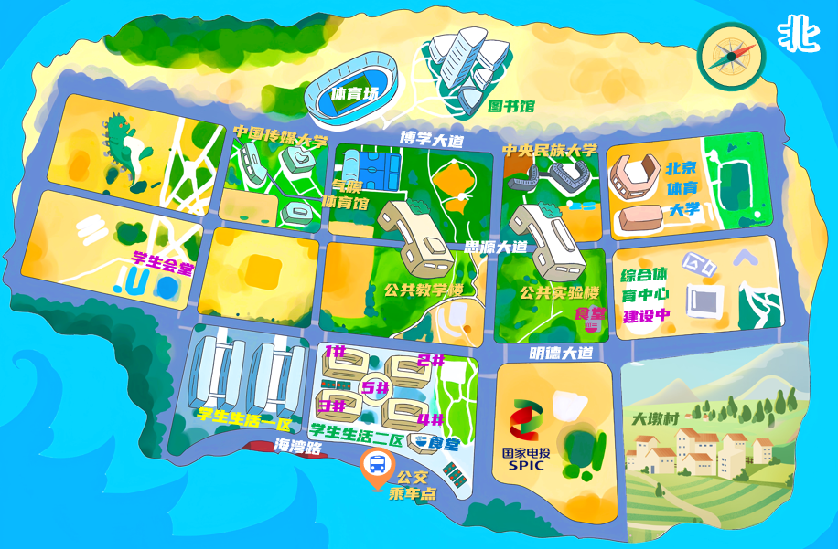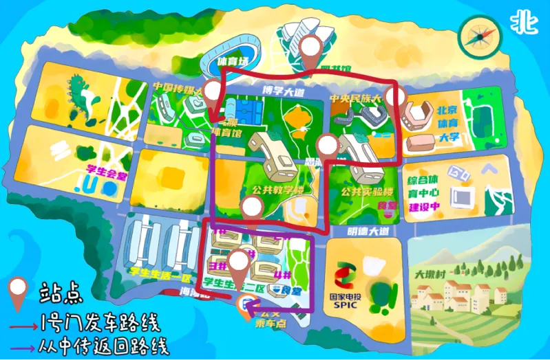 Маршрут ①: Отправление от ворот 1 жилого района 2→Через дорогу→проходя через ворота 2 → учебного корпуса Лидэ, лабораторного корпуса (на пересечении проспекта Сиюань и проспекта Цзяоронг→ эксклюзивного здания университета Минминь, эксклюзивного здания Пекинского спортивного университета→ библиотеки→ ворот 2 → ворот 1 → Чжунчуань(Источник оригинального изображения: Лон Кейю, студент Хайнаньского колледжа Глазго, Университета электронных наук и технологий Китая)