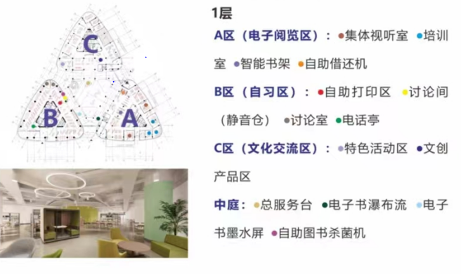 Открывающееся пространство библиотеки лианского университетского городка (Первый этап) находится с первого по третий этаж каждого блока А, В и С, общей площадью 23 000 квадратных метров и 983 местами для чтения. Среди них минус первый этаж – библиотечная зона редактирования и обработки книг, которая закрыта для читателей, а каждая зона с 1-го по 3-й этажи оборудована туалетами и кладовыми.