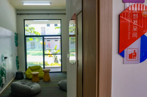 На первом этаже жилой зоны расположены комнаты для обсуждений, комнаты для медитации и оцепенения, комнаты для 24-часовых занятий, комнаты для групповых занятий и другие общественные зоны, которыми могут пользоваться студенты после бронирования.