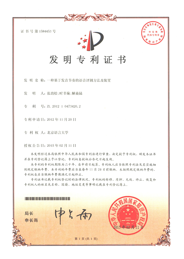 【专利名称】一种基于发音节奏的语音评测方法及装置 【专利号】ZL 2012 1 0473420.2 【专利权人】米兰电竞体育 【发明人】张劲松;时书菊;解焱陆 【授权公告日】2015年2月11日 【应用目标】 实现外国学生汉语发音节奏的自动评测。 【成果简介】 本发明设计一种基于发音节奏的语音评测方法及装置,该装置包括:GMM模型获取单元用于从被评测语音中选出训练数据,提取出所述训练数据的节奏特征参数进行训练得到GMM模型;似然度获取单元提取被测评语音的节奏特征参数作为所述GMM模型的输入,经GMM模型匹配获取相应的似然度值;评测模型获取单元用于所述似然度经过训练评测模型,根据所述评测模型对被评测语音的发音节奏进行评测。本申请所提出的技术方案用于辅助语言教学,尤其是对外汉语的教学,满足了学生学习语言的需要。另外,能及时发现学生的语音节奏中的偏误并给予他们有效的反馈,将会提高他们的语言学习效率。尤其在与日本学生学习汉语方面。 | ||||
