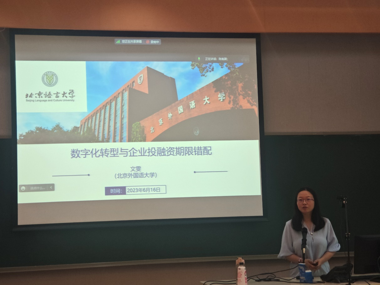 6月16日,商学院双周学术论坛系列活动(2023年第7期,总第21期)如期举行。本次论坛邀请到北京外国语大学国际商学院副教授文雯老师为学院师生带来了题为《数字化转型与企业投融资期限错配》的专题讲座,并耐心解答参会师生对讲座内容的疑问。