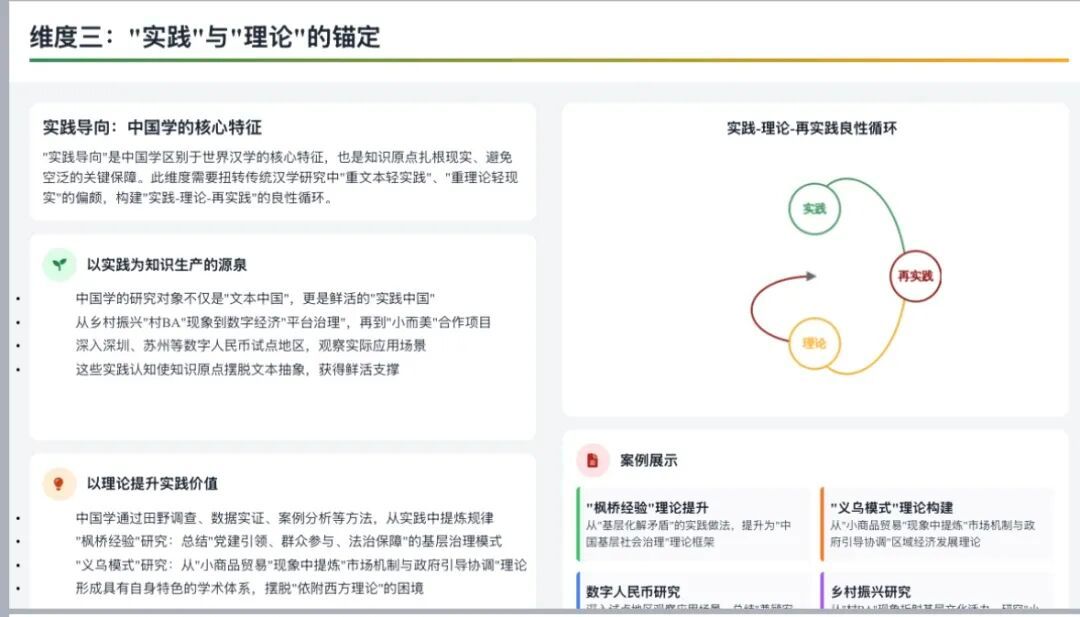 “实践导向”是中国学区别于世界汉学的核心特质,也是知识原点扎根现实、避免空泛化的关键保障。这一维度需扭转传统中国学研究中“重文本轻实践”“重理论轻现实”的偏差,构建“实践—理论—再实践”的良性循环。