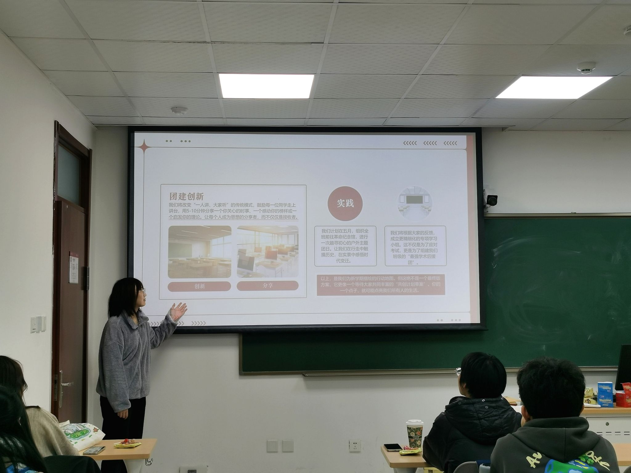 团支书唐朝创新团日形式,使理论学习“活”起来,对下一步班团建设做出计划并征求全体同学的意义建议。她建议跳出“会议室+PPT”的固有模式,倡导“我们设计,我们参与,我们收获”的共创理念,将理论学习、青年责任与创新实践深度融合,让团日活动真正“活起来、动起来、暖起来”。